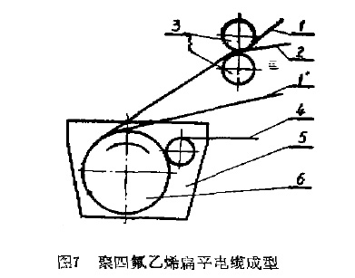 扁平電纜薄膜層壓法中先將未燃結聚四氟乙烯薄膜1和導體2在帶槽模輥對3間壓接,導體2的線間距由模輥3調節至適合規格,并同未燃結薄膜1’一起進到燒結爐5。爐內模輥6一樣為帶槽輪,燒結爐為鹽融槽,薄膜1和1’在槽體黏合并燒結為扁平電纜4。