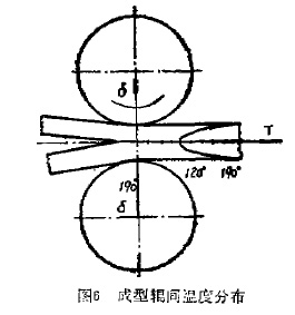 預制薄膜法成型時,未進到成型輥的薄膜處在“冷態”,必須在成型輥表層加溫軟化,聚氯乙烯傳熱系數較低,要使薄膜做到粘接溫度必須一定的加溫時間。在成型輥間的塑膠溫度梯度遍布如下圖所示,不難看出,生產制造速率低是預制薄膜成型法的原有缺點。